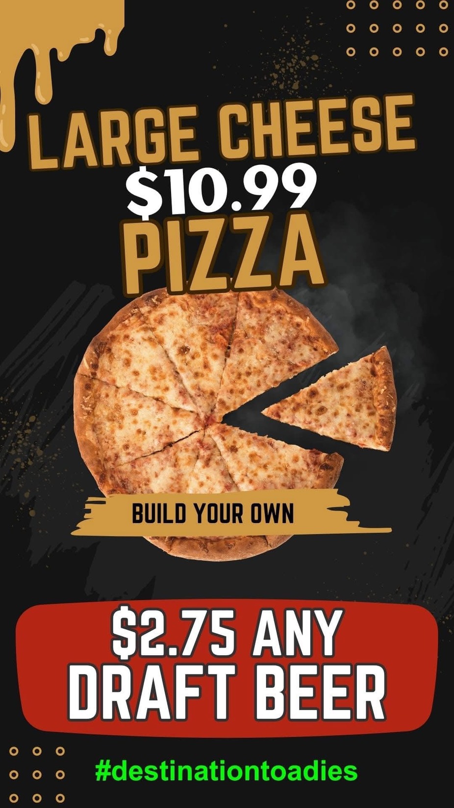$2.75 ANY Draft Beer All Day & $10.99 Large Cheese Pizza (Until 11pm)
