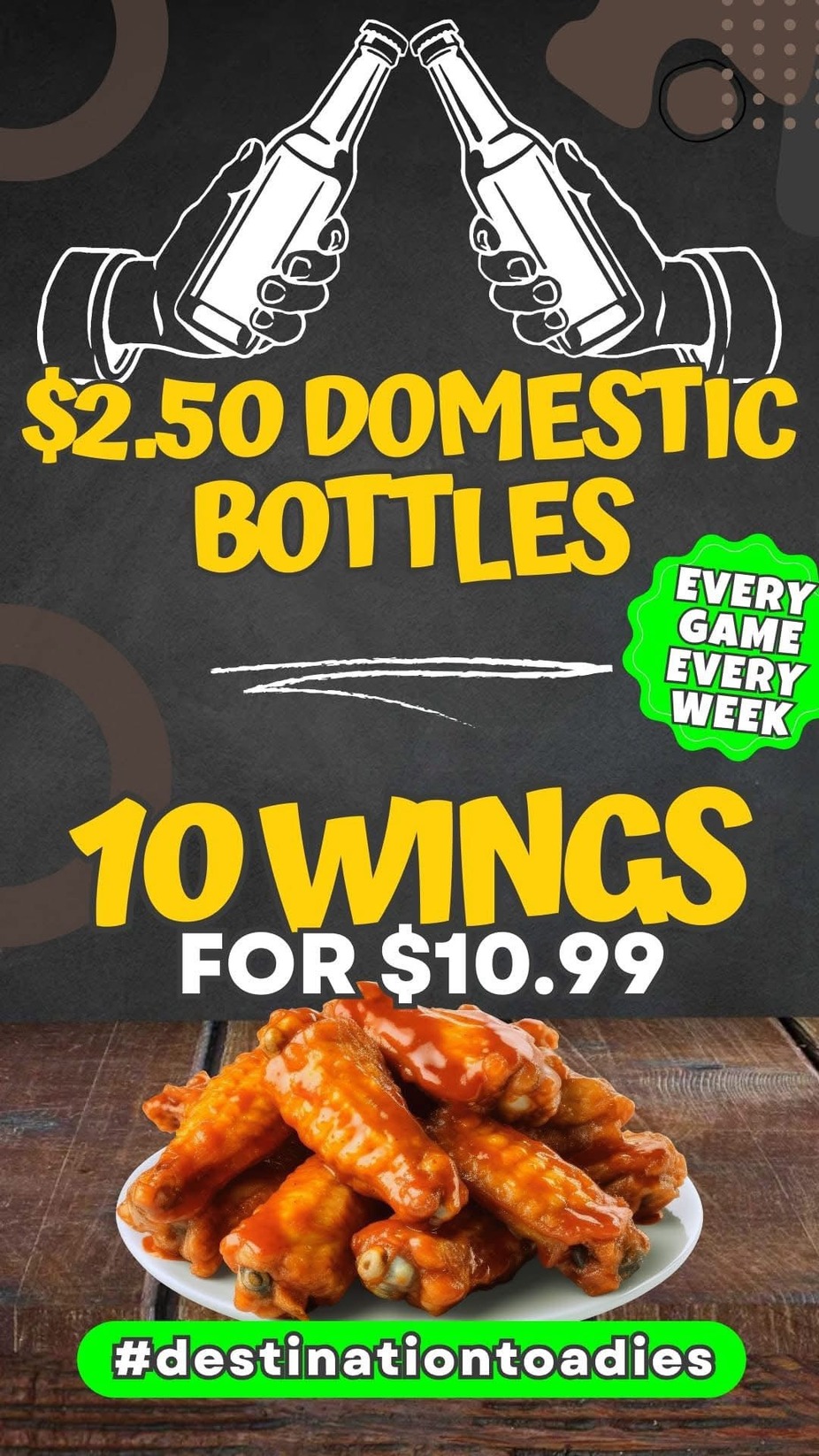 $2.50 domestic bottles & 10 wings for $10.99