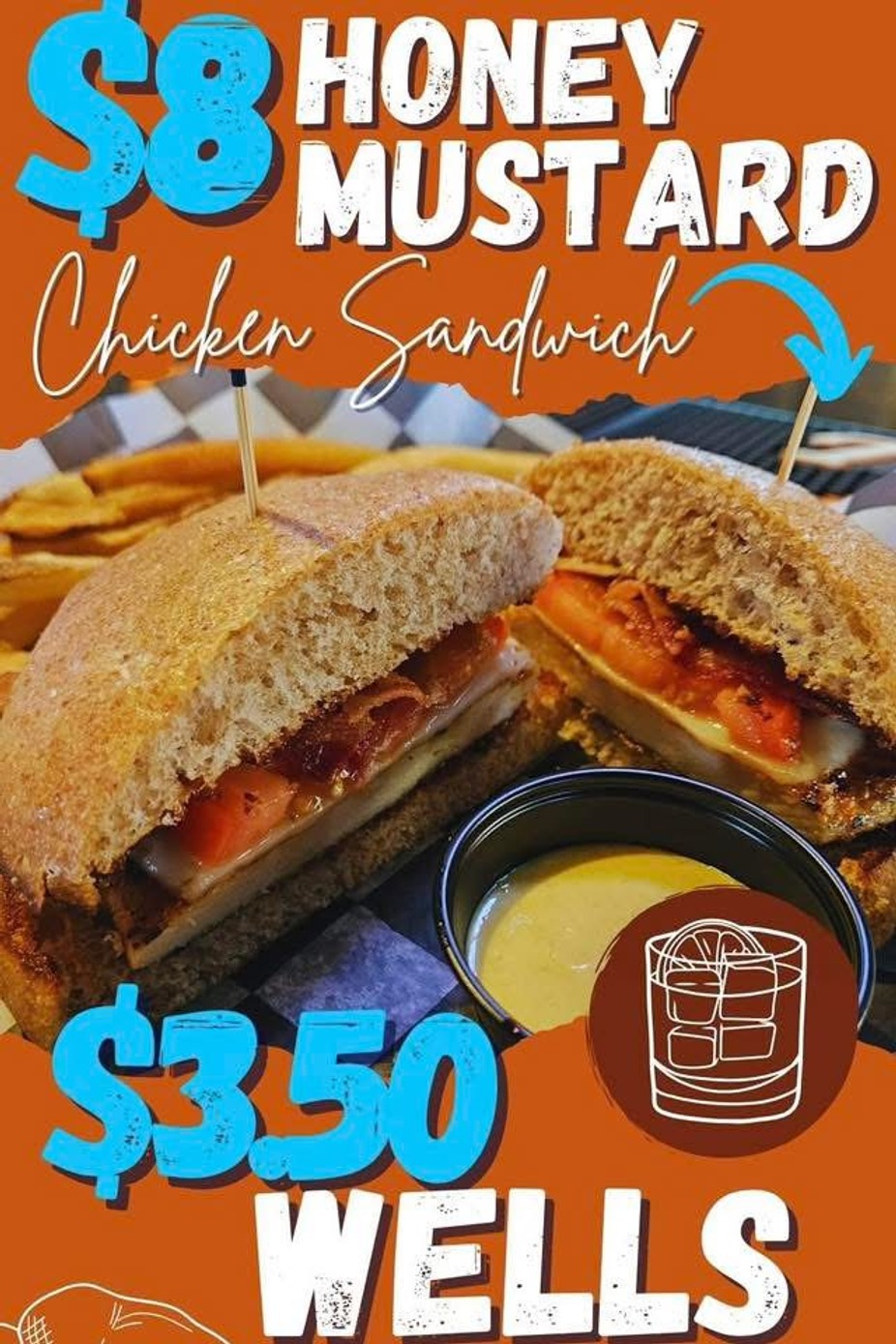 $3.50 wells & $8 honey mustard chicken sandwich